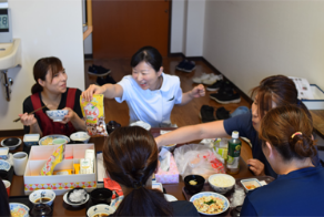 厨房さんが作る栄養と健康を考えた食事を、同僚達と談笑しながら食べます。
