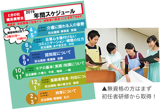 未経験・無資格者の方は、勤務時間内に、計8回(約1時間程度)勉強会行っています。